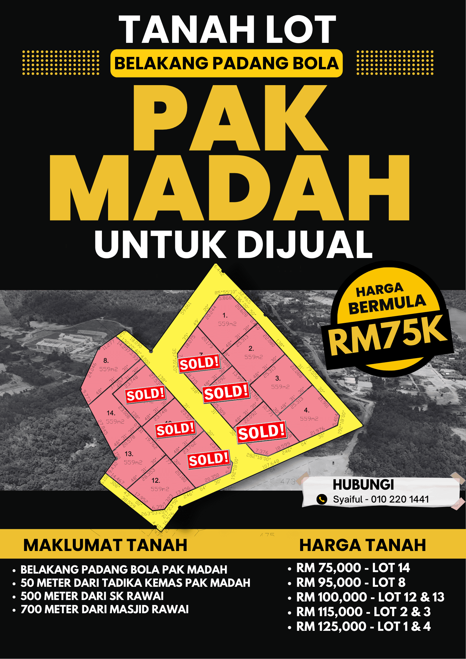 8 LOT BANGLO KG PAK MADAH, BUKIT PAYUNG (BELAKANG PADANG BOLA). Tanah lot banglo cantik siap tambung, geran individu boleh pindahmilik segera hanya 5 minit ke Masjid Bukit Payong. Spesifikasi : 🏠Geran individu syarat bangunan. 🏠Hak milik kekal/rizab melayu. 🏠Keluasan 559mps. 🏠Harga bermula RM75k-RM125k. Berdekatan: 📌3.6km ke Masjid Bukit Payong. 📌3.7km ke Pekan Bukit Payong. 📌17km ke Bandar Kuala Terengganu. CASH @ LPPSA. Untuk LPPSA kami uruskan sampai siap